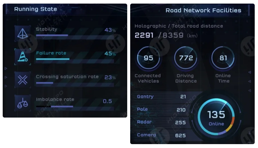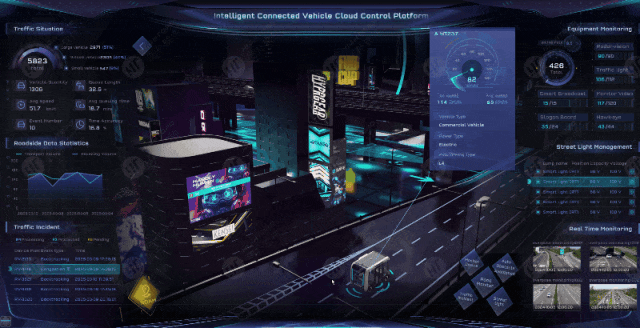 可视化大屏结合 GIS 地图,辅以左右两侧面板进行展示,展示了数据平台运行状态、交通流量趋势、重要拥堵和警情指数、路网信息等,智能网联汽车云控平台借助图扑 HT 丰富多样的图表、图形以及设计元素,把相对复杂、抽象的数据转化为可视化形式,以更直观、易于理解的方式呈现出来。
