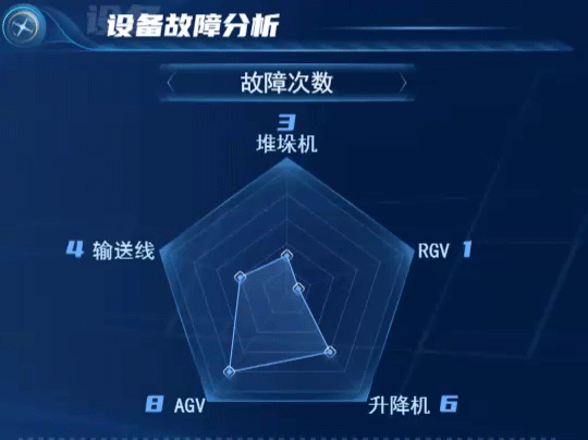 对堆垛机、AGV、升降机、RGV 等设备的稼动率利用不同颜色折线进行展示,供用户直观看到这些关键设备各月的稼动率情况;同时对于各个设备,根据实时状态接口展示它们的在线/离线等情况。敦促用户对于异常设备及时检查维护,及高强度运行设备及时进行保养点检。可视化图标监控意在实现数据共享化、响应实时化、操作可视化的目的。