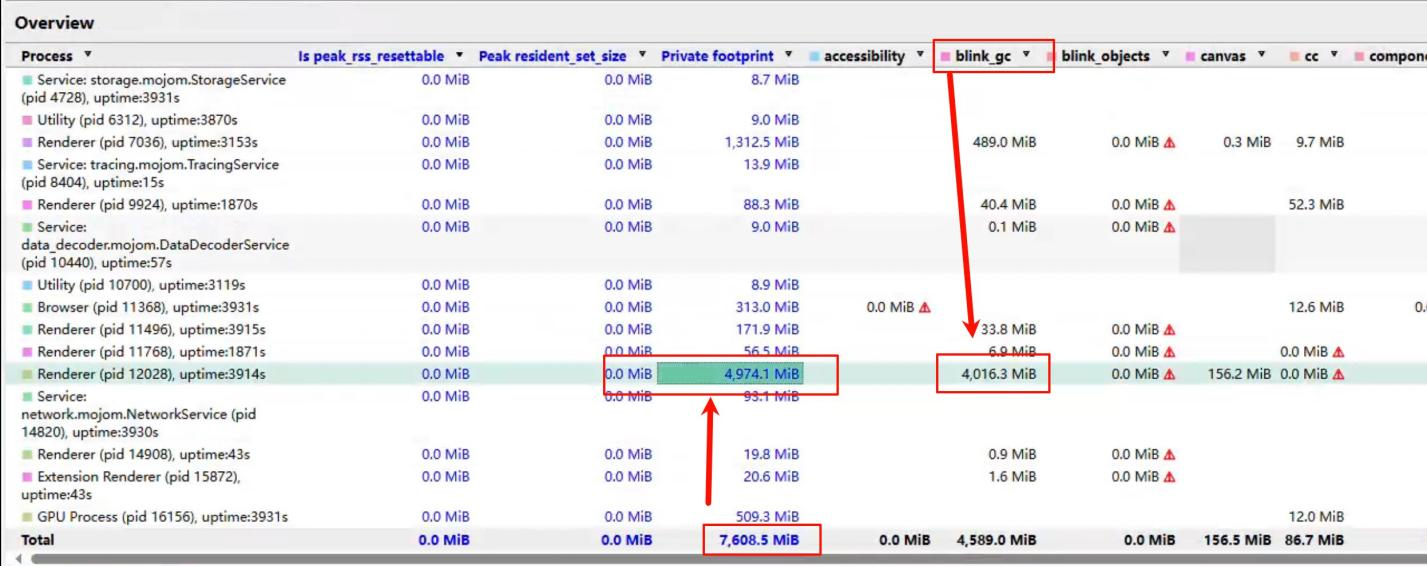 在本案例中,机器总内存高达 64GB,资源充裕,Chrome 判断无需迫切回收。为避免不必要的性能开销(一次完整的 GC 会消耗 CPU 资源),GC 选择推迟回收操作。因此,我们看到的 4GB 占用,实际上是 Oilpan GC 持有的一个较大的内存池,其中包含了活动对象和大量待回收的“垃圾”对象。只要这个内存池的大小趋于稳定,没有出现持续、无节制的增长,通常就不构成内存泄漏问题。
