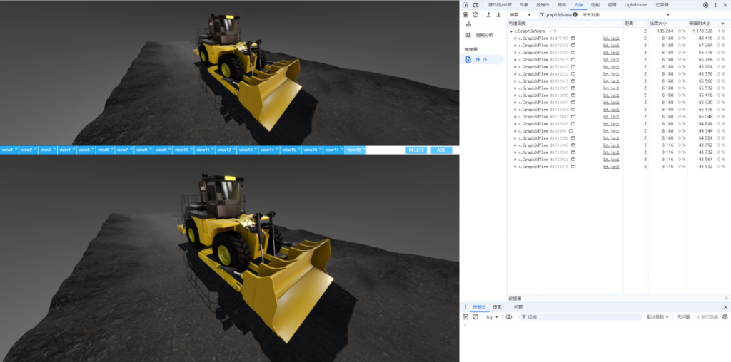 - 删除最新的视图后,首个 WebGL 恢复,且删除后事件监听器占用的内存下降,由于 HT 是 MV 框架,虽然浏览器销毁了 WebGL 上下文,但是视图的数据模型仍然保留,这也就是首个视图“复活”的原因。