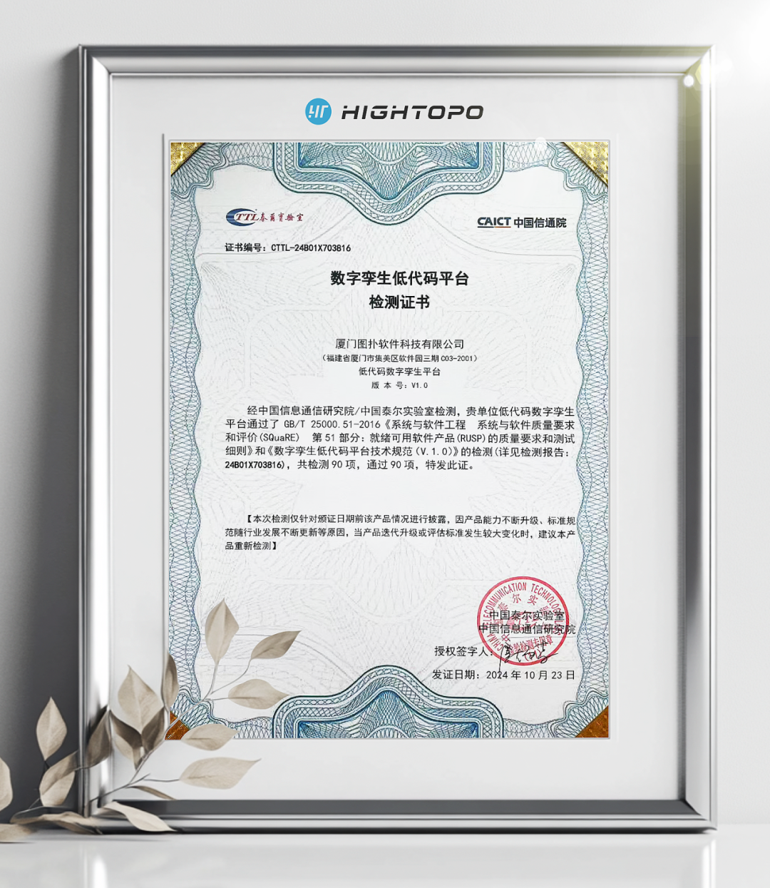图扑软件自主研发的“数字孪生低代码平台”产品,顺利通过 90 项严格测评,荣获中国信通院检测认证证书。机构专家从功能完备性、易用性、平台开放度、性能优越性等维度开展技术测评,覆盖业务逻辑设计、技术发展趋势、行业应用要求、国产化适配、多协议支持、特色功能实现等多个方面。