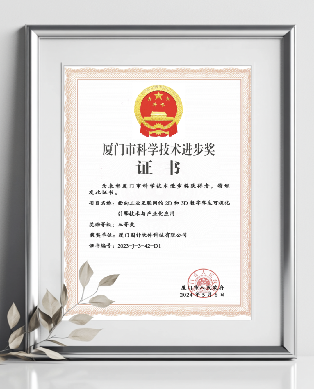 图扑软件团队以《面向工业互联网的 2D 和 3D 数字孪生可视化引擎技术与产业化应用》荣获厦门市科学技术进步奖三等奖。