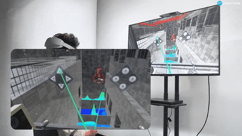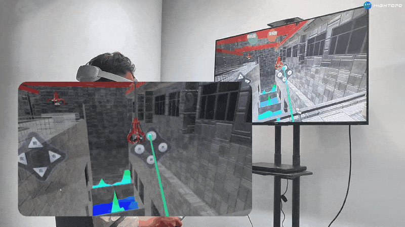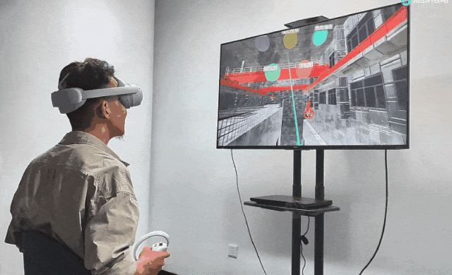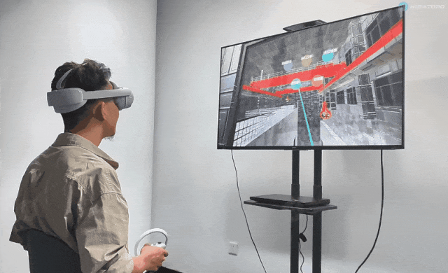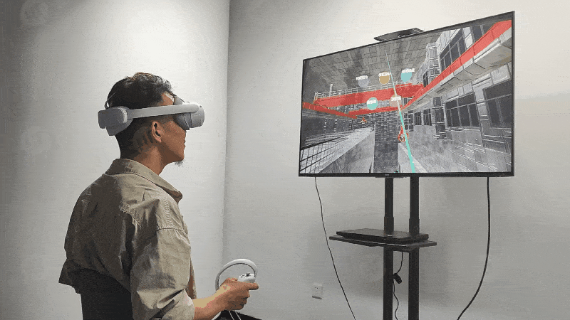 用户通过 VR 头显与操作手柄组合,可实现与行车吊操作面板的联动控制:佩戴设备后,视野将同步呈现 1:1 还原物理场景的 VR 设备模型及配套虚拟操作手柄,手柄投射的交互射线可精准响应虚拟环境操作,射线指向目标物体时自动触发预设自定义事件,实现沉浸式精准操控。