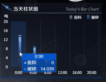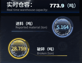 系统支持 2D 数据面板与 3D 场景深度嵌套叠加,面板涵盖当前行车位置、抓斗实时坐标、仓容动态数据、当日投炉物料重量、破碎处理量等核心指标,通过图扑 HT 丰富的图表组件直观呈现设备状态与作业统计信息。同时支持历史数据回溯查询,满足多场景数据追溯需求。