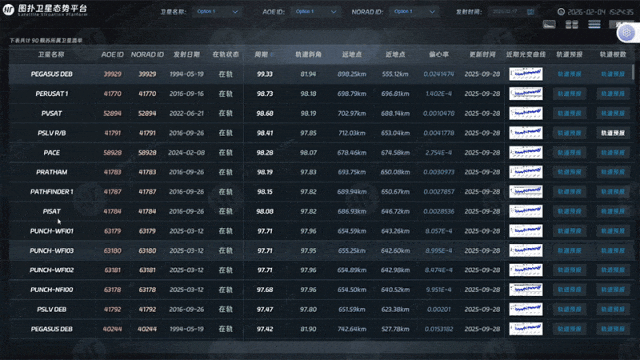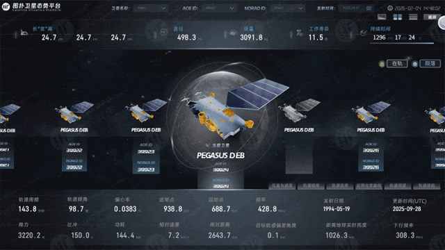 平台整合实时采集的入轨卫星核心参数,包括入轨质量、入轨时间、工作时长、轨道周期、姿态偏差等,通过 HT 可视化大屏直观呈现卫星全态运行轨迹,让在轨卫星运行状态一目了然。
