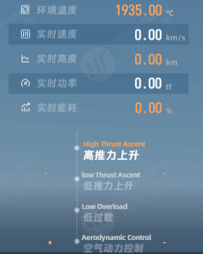 页面两侧依托可视化图表,直观呈现模拟环境数据列表、火箭发射实时数据、相对距离与速度变化、实时及预测功率等核心维度,同步展示发射过程中火箭的实时重量、飞行高度、动力功率、能耗数值、任务持续时长、实时经纬度等关键指标。