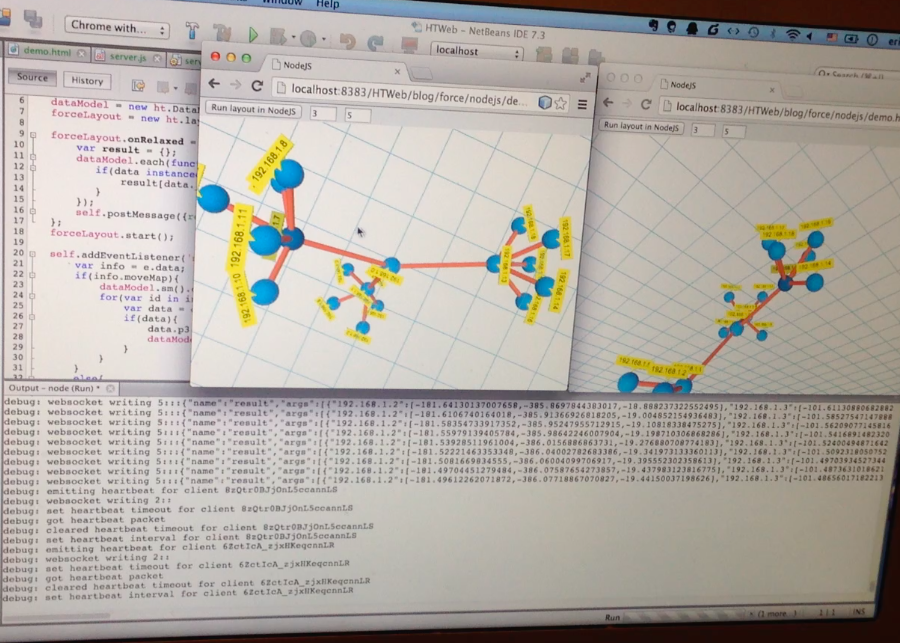 1、首选和Web Workers一样,跑在Node.js的类库肯定不能操作window和document之类的页面特定元素对象,从这点说很多考虑不周全的类库会把自己限制死只能在页面主线程运行,这点HT for Web考虑得很周到,不仅ht.js包括所有ht-forcelayout.js插件都是可运在Web Workers和Node.js的非GUI环境,因为我也常需要ht.js运行在后台直接将DataModel的数据和前台进行JSON的数据格式转换存储。